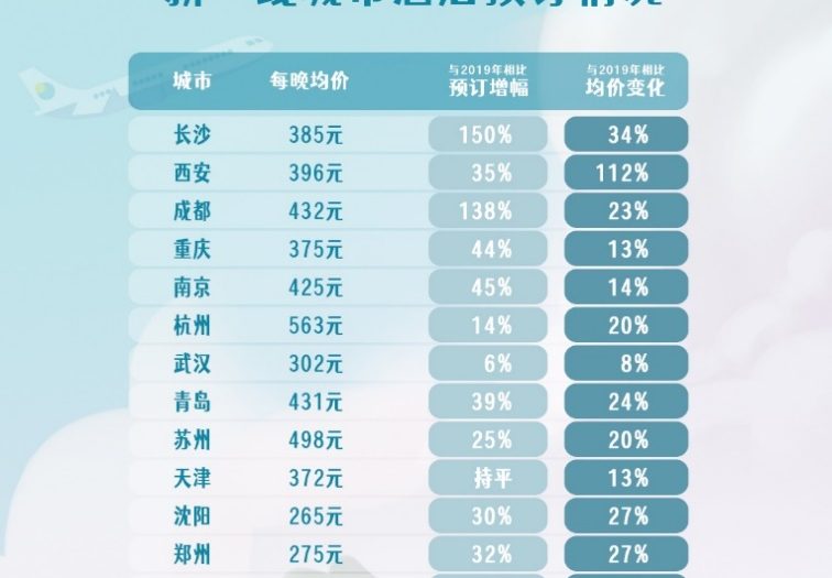 另一方面,從五一假期的住宿情況來看,長沙實紅。截至目前,長沙的酒店預訂熱度位居國內第二,每晚均價385元。與2019年同期相比,長沙酒店預訂增長1.5倍,增幅領跑新一線城市。