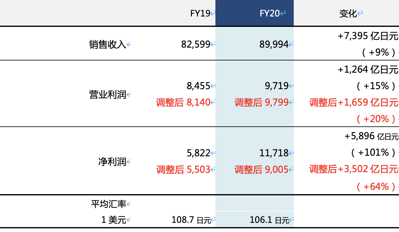2020財年,索尼集團共錄得銷售收入89,994億日元,較去年增長9%;營業利潤達9,719億日元,凈利潤達11,718億日元。去除本財年股權交易、稅率差異、庫存減記、新冠全球援助基金支出等一次性因素,營業利潤同比增長20%,凈利潤同比大漲64%。
