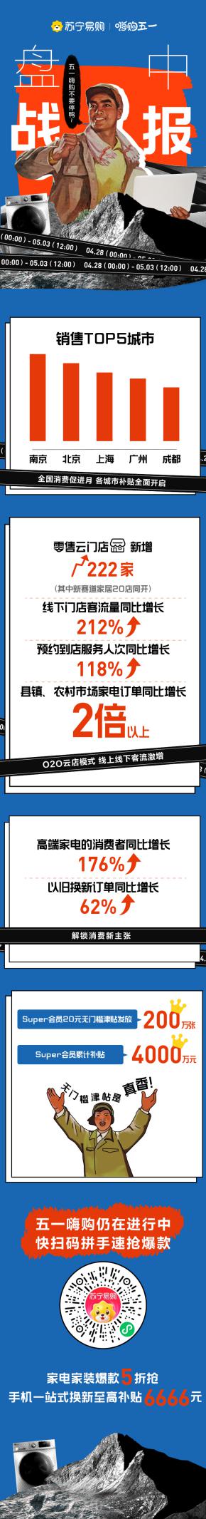 速途網5月3日訊(報道:喬志斌)今日,蘇寧發布了“五一戰報”:截至5月3日,18點“嗨購五一”活動中,線下門店客流量同比增長212%;預約到店服務人次同比增長118%;零售云板塊各項數據均有爆發式增長:零售云門店新增222家,其中新賽道家居店有20店同開;縣鎮、農村市場家電訂單同比增長2倍以上。其中,銷量前五位的城市分別為南京、北京、上海、廣州和成都。