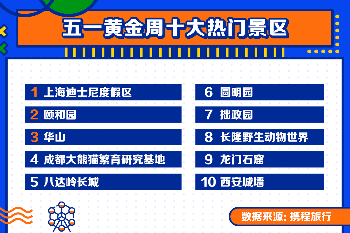 上海迪士尼度假區、頤和園、華山、成都大熊貓繁育研究基地、八達嶺長城、圓明園、拙政園、長隆野生動物世界、龍門石窟、西安城墻躋身“五一”黃金周熱門景區TOP10。