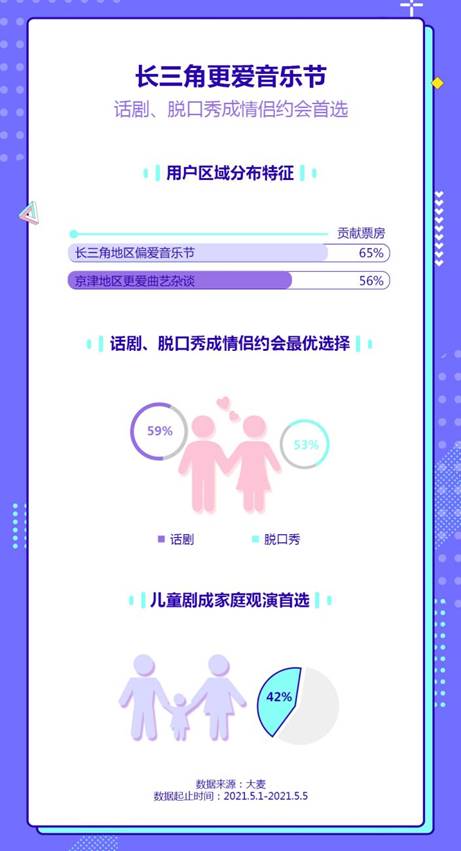 “她經濟”時代,女性現場演出消費力明顯領先。今年五一小長假期間,線下演出女性消費較2019年穩步提升至69%。分品類來看,音樂劇最受女性用戶的青睞,她們的消費占比高達86%。游展成女性消費新趨勢,消費占比同比2019增加了21%。在演唱會品類中,生來知己《山河令》主題演唱會女性用戶占比為90%。此外,話劇、脫口秀成情侶約會最優選擇,情侶購票占比分別為59%和53%;兒童劇成家庭觀演首選,占比為42%。
