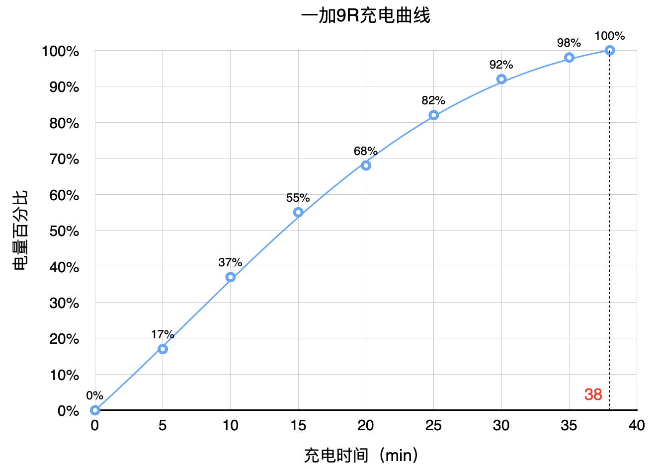 實測使用官方原裝充電器為一加 9R進行充電,15分鐘即可充電55%,0-100%充電僅需耗時38分鐘。