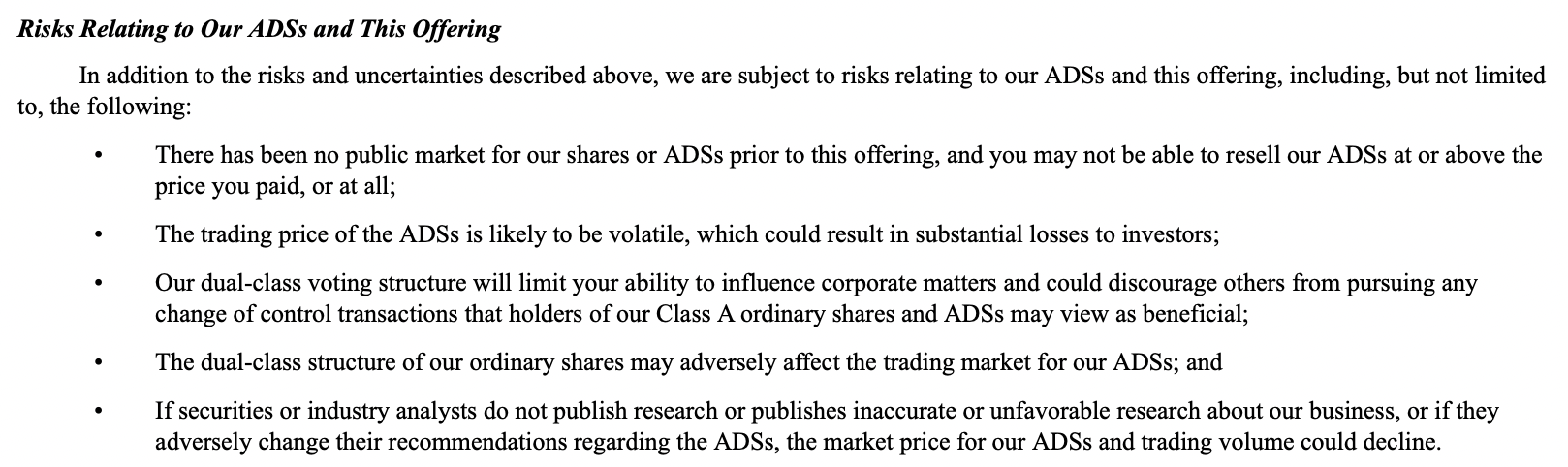 圍繞美國上市公司的中國公司提起訴訟和負面宣傳可能導致對我們監管的更多審查,并對ADS的交易價格產生負面影響,并可能對我們的業務產生重大不利影響,包括我們的運營結果、財務狀況、現金流和前景;以及