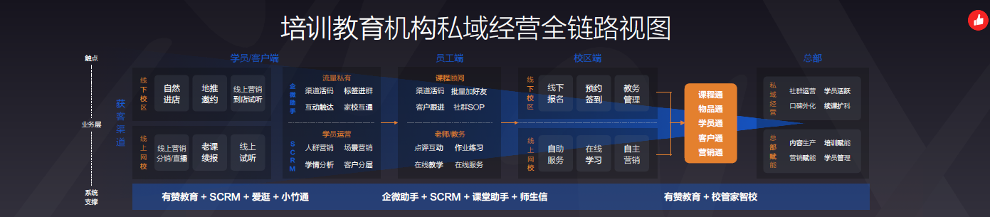 在校區和總部端,打通有贊教育和校管家智校,可構建線下校區經營和線上網校的營銷教學服務能力,以及實現總部對于各個校區的賦能和管控能力。