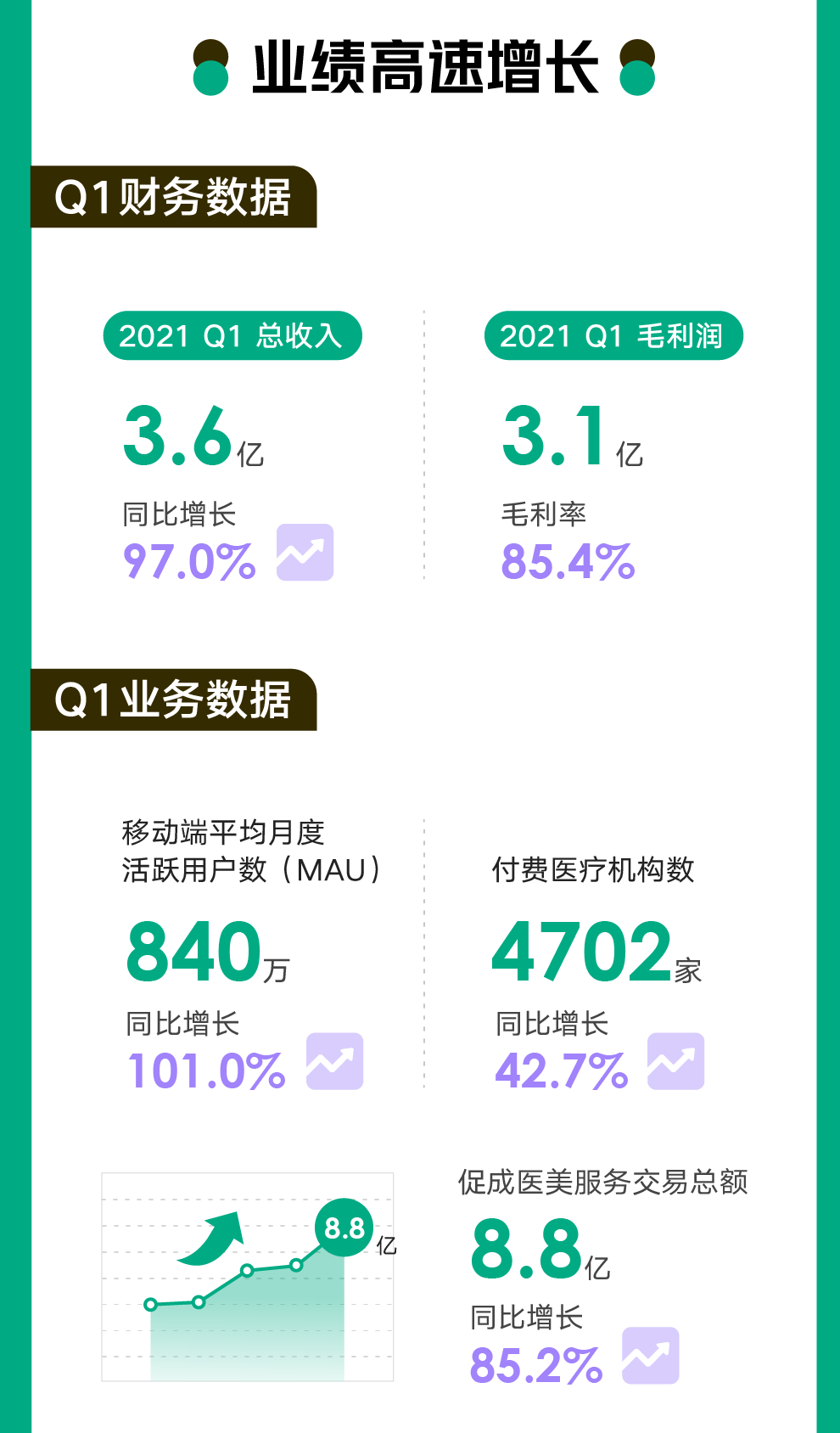 財報數(shù)據(jù)顯示,2021年第一季度,新氧科技總收入3.596億元人民幣(5,490萬美元),超過上季度業(yè)績指引,同比大增97.0%。毛利率85.4%,在去年同期76.4%的基礎(chǔ)上實現(xiàn)顯著增長。移動端平均月活躍用戶840萬,同比增長101.0%。付費醫(yī)療機構(gòu)數(shù)4,702家,同比增長42.7%。付費用戶數(shù)17.3萬人,同比增長123.3%。