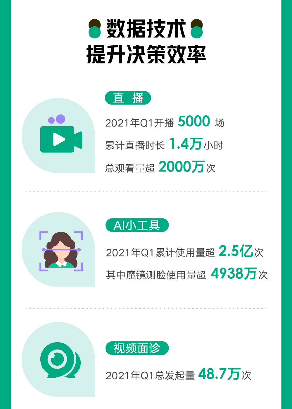 此外,視頻面診、魔鏡測臉等工具,也已經(jīng)成為新氧用戶必不可少的在線輔助工具。今年一季度,新氧視頻面診發(fā)起量48.7萬次,單日最高發(fā)起量14729次。包括魔鏡測臉在內(nèi)的新氧AI小工具,一季度使用量超過2.5億次。