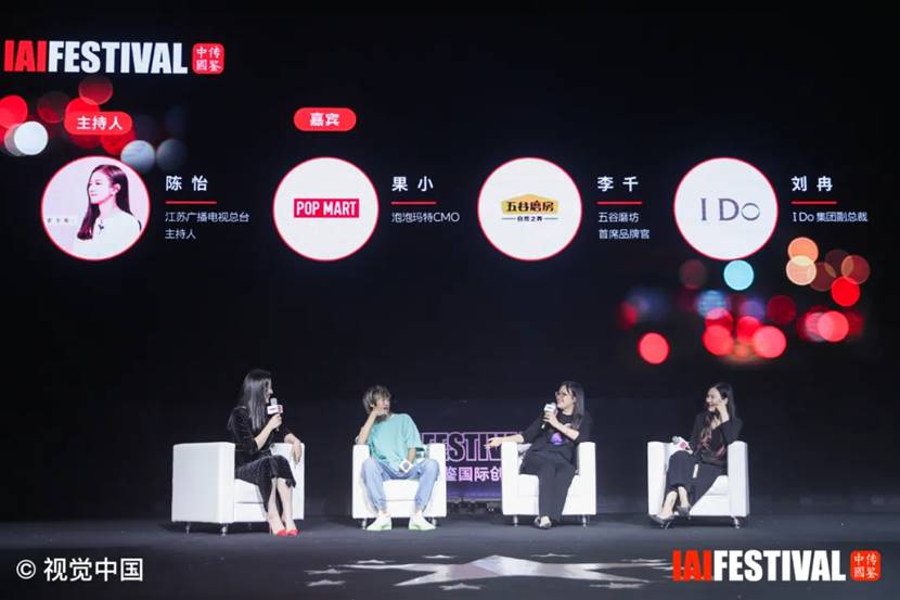 江蘇衛視主持人陳怡、泡泡瑪特CMO果小、五谷磨房有限公司首席品牌官李千和I Do集團副總裁劉冉(從左至右)
