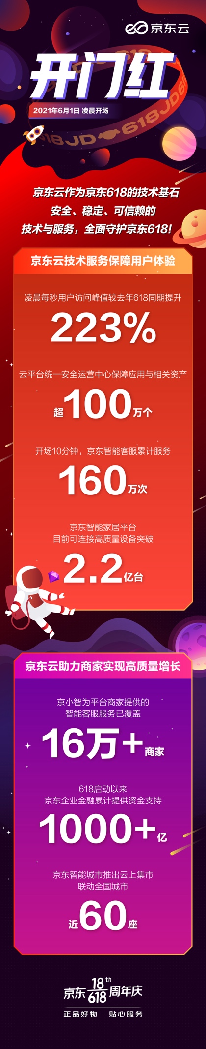數據還顯示,當日凌晨京東云每秒用戶訪問峰值較去年同期提升223%;京東智能客服凌晨開場10分鐘已累計服務用戶160萬次;京東企業金融在618期間則為各類線上、線下商家提供包括京小貸、京保貝、企業金采、動產融資、京票秒貼、企業雇主保等金融產品,618啟動以來累計為30萬家企業提供超千億元的資金支持。