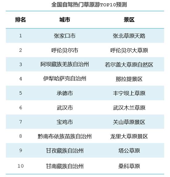 熱門草原游中張家口市的張北草原天路最為熱門,其次是呼倫貝爾的呼倫貝爾大草原和阿壩藏族羌族自治州的若爾蓋大草原自然區。