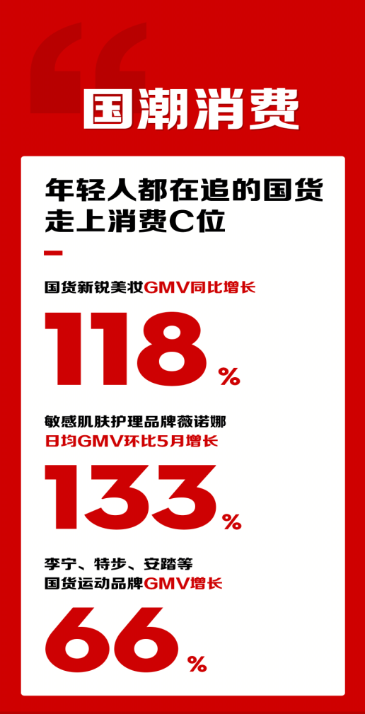 618期間,蘇寧易購(gòu)國(guó)潮新銳美妝GMV同比增長(zhǎng)118%,敏感肌膚護(hù)理品牌薇諾娜日均GMV環(huán)比5月增長(zhǎng)133%。以李寧、特步、安踏等為代表的國(guó)潮運(yùn)動(dòng)品牌,GMV增長(zhǎng)66%。