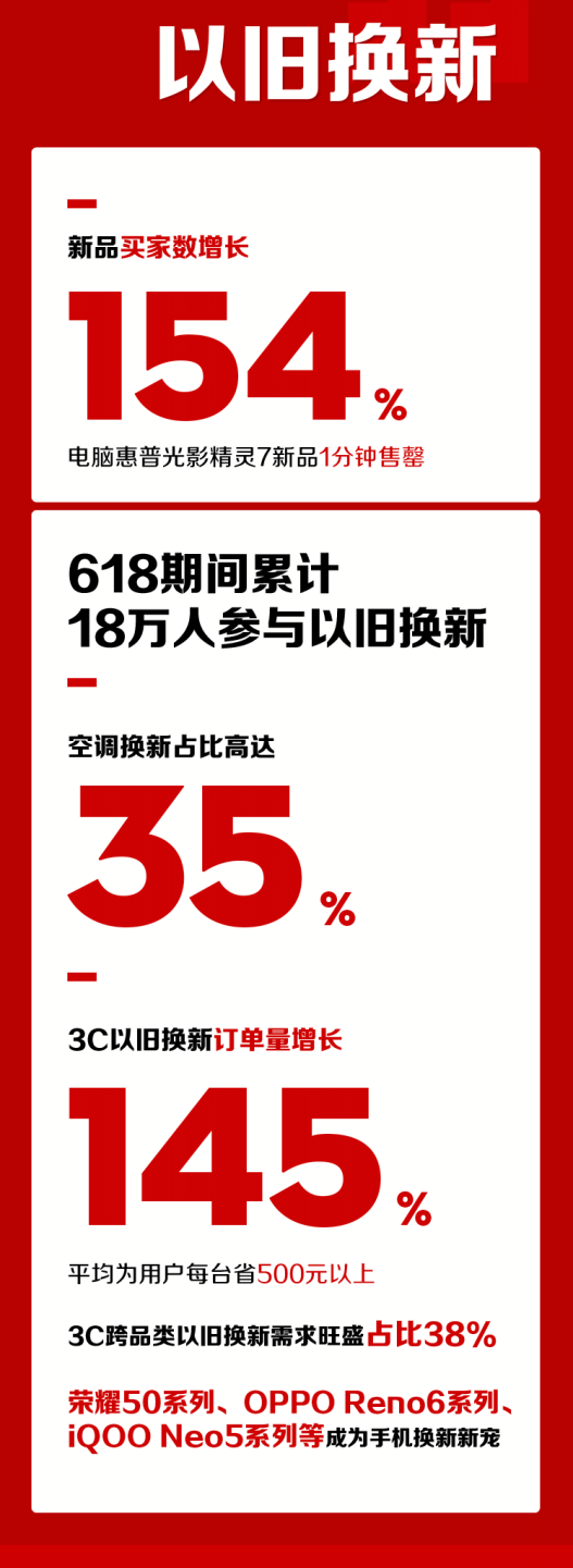 其中,空調(diào)換新占比高達(dá)35%。3C以舊換新訂單量同比增長(zhǎng)145%,占換跨品類換新訂單總量的38%,平均每單為用戶省500元。榮耀50系列、OPPOReno6系列、iQOO Neo5系列等成為手機(jī)換新新寵。