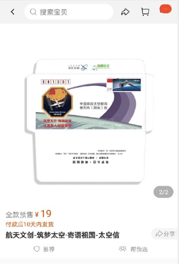 “中國航天文創(chuàng)”淘寶店首次上架“太空信”套裝