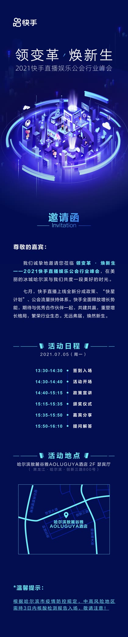 7月5日,“領變革 · 煥新生”2021快手直播娛樂公會行業峰會將來到“冰城”哈爾濱,廣邀各地直播公會參與,會上快手公會運營負責人顧北將重點解讀公會新分成政策、流量政策、產品功能、城市代理等核心模塊,為公會發展量身打造星級權益,并剖析娛樂直播公會市場,助力公會在快手上更好更快發展。