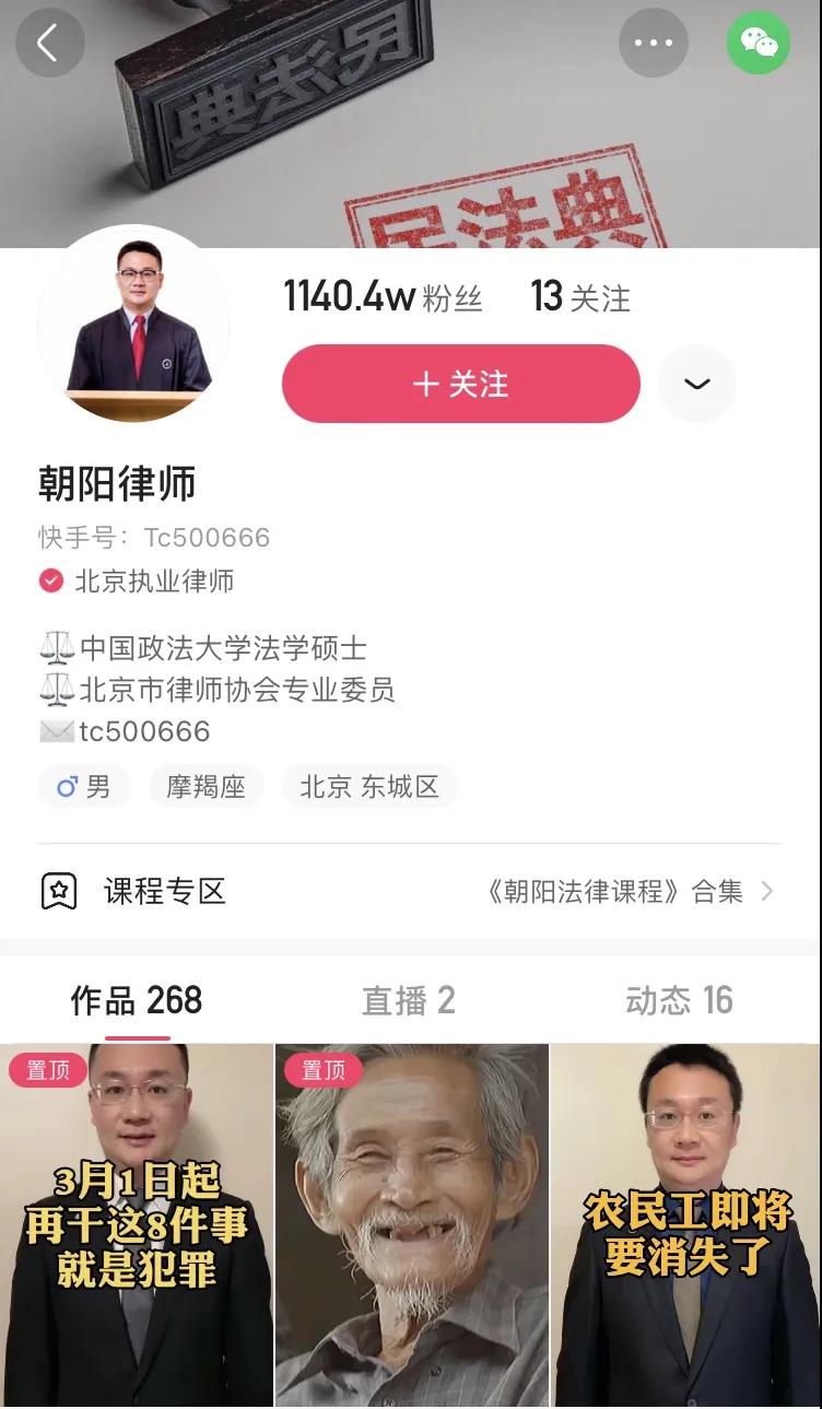 短視頻也是“曰法三章”另一發力方向??焓衷O立了#曰法三章話題,將律師發布的短視頻等內容集中展現。據了解,目前快手已經有大量民間律師或政法從業者入駐,形成“民間普法人”團體,一定程度上紓解了群眾對于學習法律知識、解決生活問題的剛需。以有“快手第一法律主播”之稱的@朝陽律師為例,本名楊朝陽,中國政法大學法學碩士畢業,也是北京市律師協會專業委員,2016年入駐快手以來,長期從熱門話題及事件中進行取材,以簡潔、生動、易懂的語言錄制普法短視頻,收獲千萬粉絲,最受歡迎的一條短視頻就有十萬人留言評論。