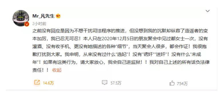 今早,吳亦凡在微博對近期的傳聞進行了回應,他表示:之前沒有回應是因為不想干擾司法程序的推進,但沒想到我的沉默卻縱容了造謠者的變本加厲,我已忍無可忍!本人只在2020年12月5日的朋友聚會中見過都女士一次,沒有灌酒、沒有收手機、更沒有她描述的各種“細節”,當天聚會人很多,都會作證!我很抱歉打擾到大家。我申明,從來沒有過什么“選妃”!沒有“誘奸”“迷奸”!沒有什么“未成年”!如果有這類行為,請大家放心,我會自己進監獄!!我對自己上述的所有話負法律責任!!