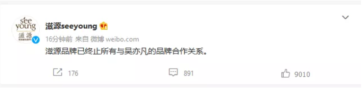 同樣,滋源也在今日與吳亦凡結束了品牌合作代言關系。