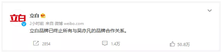 今日,立白官方微博發布消息稱,其已終止與吳亦凡所有品牌合作關系。