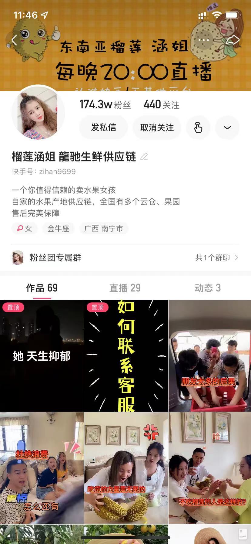 涵姐在成為榴蓮涵姐之前,就在做水果行業的微商了。看到別人在快手直播帶貨,涵姐也想試試直播賣水果,為此她專門去跟朋友學習拍短視頻,還上網搜直播教程。并在那時,涵姐加入了現在公司龍馳果業,一家專業做水果供應鏈的企業。正巧趕上公司組建電商部門,老板敏銳地察覺到未來幾年電商的風口在直播上,于是兩人一拍即合,開啟了在快手的直播帶貨之路。