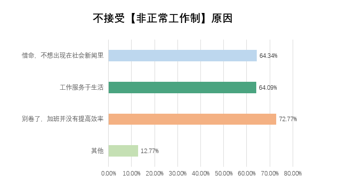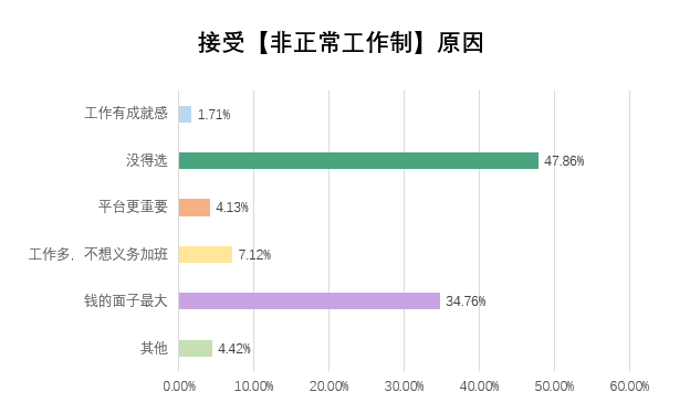 問卷結果顯示,在“勉強接受”及“完全接受”非正常工作制的互聯網從業者中,47.9%的人認為自己“沒得選”,34.8%的人則是為了獲得更高的薪資回報。