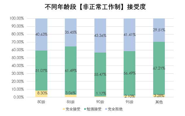 有趣的是,非正常工作制經歷最多的90后,也成為最堅決說“不”的群體。數據顯示,82%的90后互聯網人都曾有過非正常工作制經歷,而43%的90后對非正常工作制堅決拒絕,均占比最高。而8.3%的80后表示“完全接受”,成為互聯網行業中最辛勤一代。61.5%的85后“口嫌體直”,雖不情愿但能勉強接受。