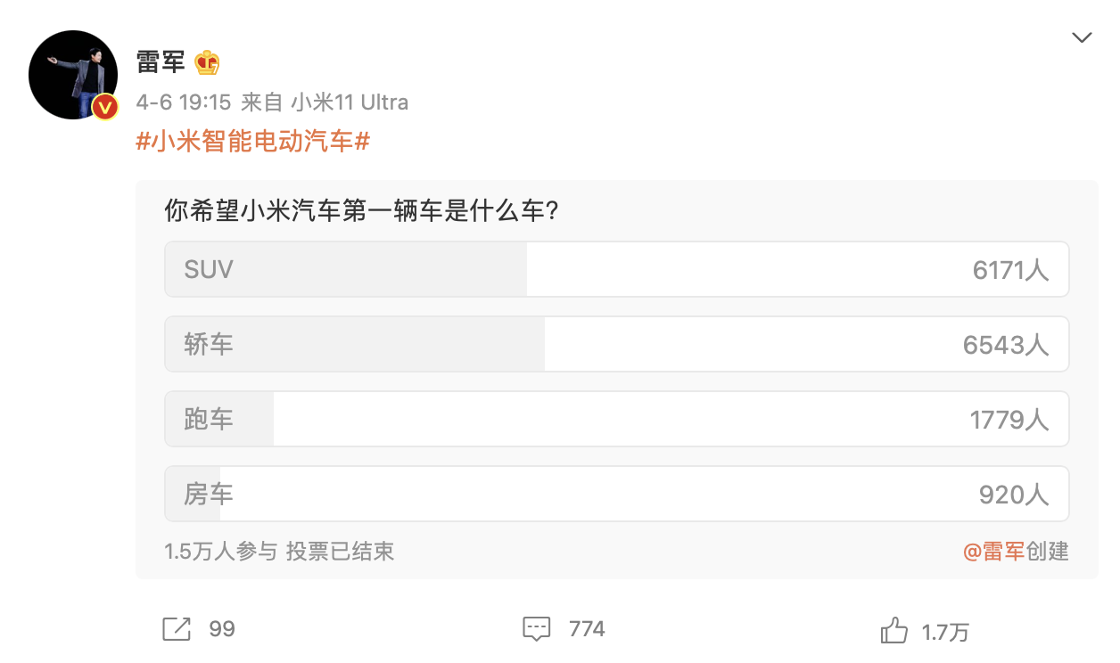 4月6日,雷軍在微博發布投票,向網友征集“小米汽車第一輛車大約是什么價錢、第一輛車是什么車”時,其中價格越高投票人數越少,而在車型方面,SUV、轎車兩個選項基本持平,并大幅領先跑車、房車選項。