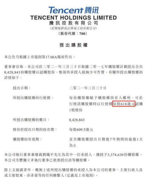 騰訊一直有給總裁劉熾平授予期權的傳統。最近的一次,是在今年的3月底,以行權價618/股,共授予3,374,630份。