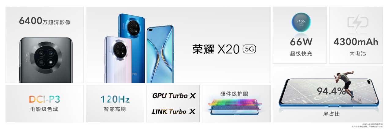本次發布會上發布的榮耀手機新品,除榮耀Magic3系列外,還有榮耀X20。榮耀X20配備一塊屏占比高達94.4%的超窄邊全視屏,支持120Hz智能動態幀率、DCI-P3色域、原彩顯示、硬件級護眼等多項特質。而為了打造更優秀的快充體驗,榮耀X20直接配備了旗艦級標準的66W超級快充,15分鐘可充至50%電量。