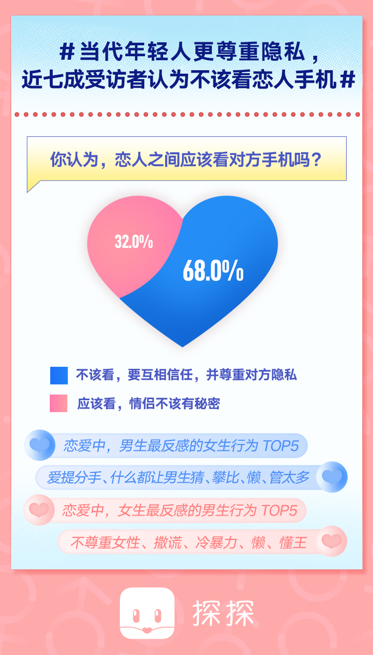 在感情史方面的調查顯示,超過六成的用戶不在乎對方的戀愛次數,更加在意戀愛中對方的人品。21.4%男性用戶表示介意對方戀愛次數多,女性這一比例為16.3%。通過調查發現,年輕用戶普遍邊界感清晰,68%的用戶表示應該尊重對方隱私,不應該看對方手機。