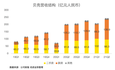 在二季度表現上,二手房交易服務營收96.3億,同比去年同期微增4.9%,遠低于整體營收20%的增速。雖然去年同期二手房交易基數較高,但相比今年一季度的102億營收,貝殼二手房在二季度環比是下降的。普遍來說,一季度受春節影響,往往是全年二手房交易最冷淡的時節。