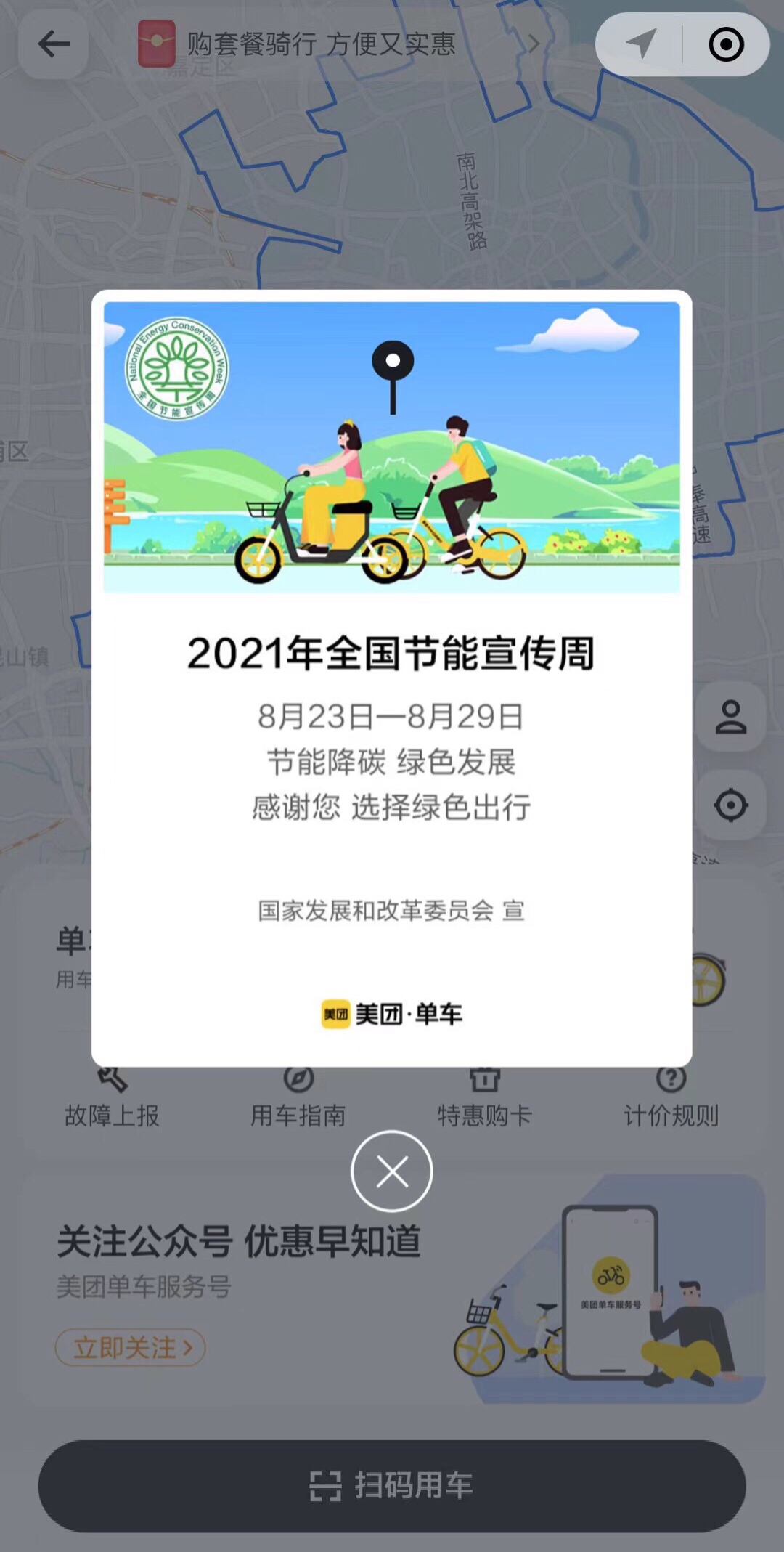 全國節能宣傳周期間,美團單車配合國家節能中心,圍繞“節能降碳,綠色發展”主題,面向公眾發出節能減碳倡議,鼓勵和引導用戶養成低碳生產和生活方式,多騎行助力城市降碳,共建綠色城市。美團App上線彈窗提示用戶節能降碳,選擇綠色出行,用自身行動為城市減碳貢獻力量。同時,廣大市民在“國家節能宣傳平臺”微信公眾號參與節能知識問答還有機會獲得美團單車騎行年卡,在獲得節能降碳知識的同時,還可以享受在全國范圍內免費騎行。
