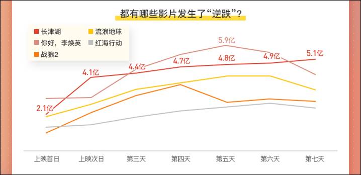 在其中,《長津湖》無疑在其中扮演了引領者的角色。該片自9月30日開畫取得2.05億票房后,在次日斬獲4.10億票房,不僅打破了由《我和我的祖國》創造的國慶檔單日票房3.88億的紀錄,而且相較前日“逆跌”幅度達到100%,并從此開啟了連續5天的“逆跌”之路。報告認為,連續的“逆跌”是爆款形成的標志,該現象多出現在年度頭部檔期,優質影片能夠不斷帶動更多新用戶走進影院。
