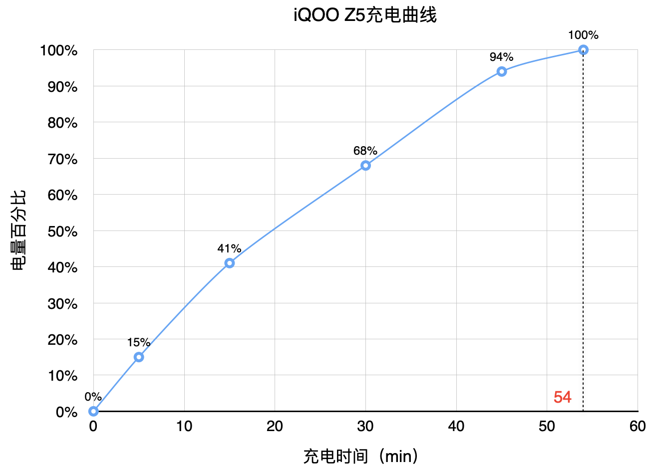 在充電方面,iQOO Z5則支持44W有線快充,實測半小時即可為手機充電68%,0-100%充電共耗時54分鐘。