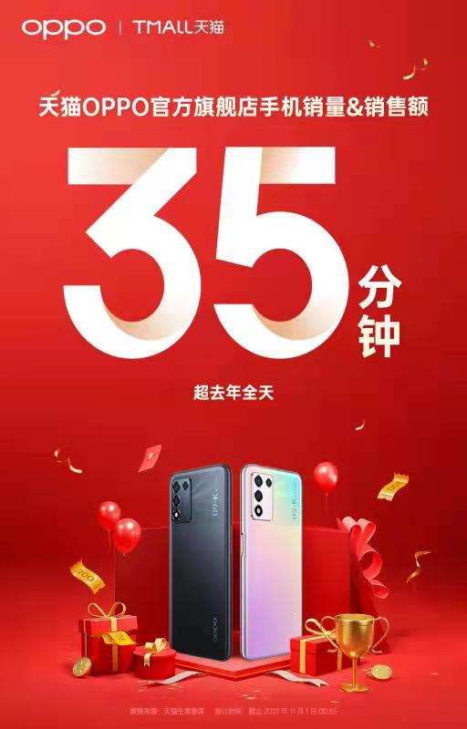 速途網11月1日訊(報道:喬志斌)今日,OPPO發布雙11開門紅戰報。數據顯示,僅35分鐘天貓官旗手機銷量&銷售額超去年全天,K9s 斬獲天貓平臺價位段銷量 TOP3。