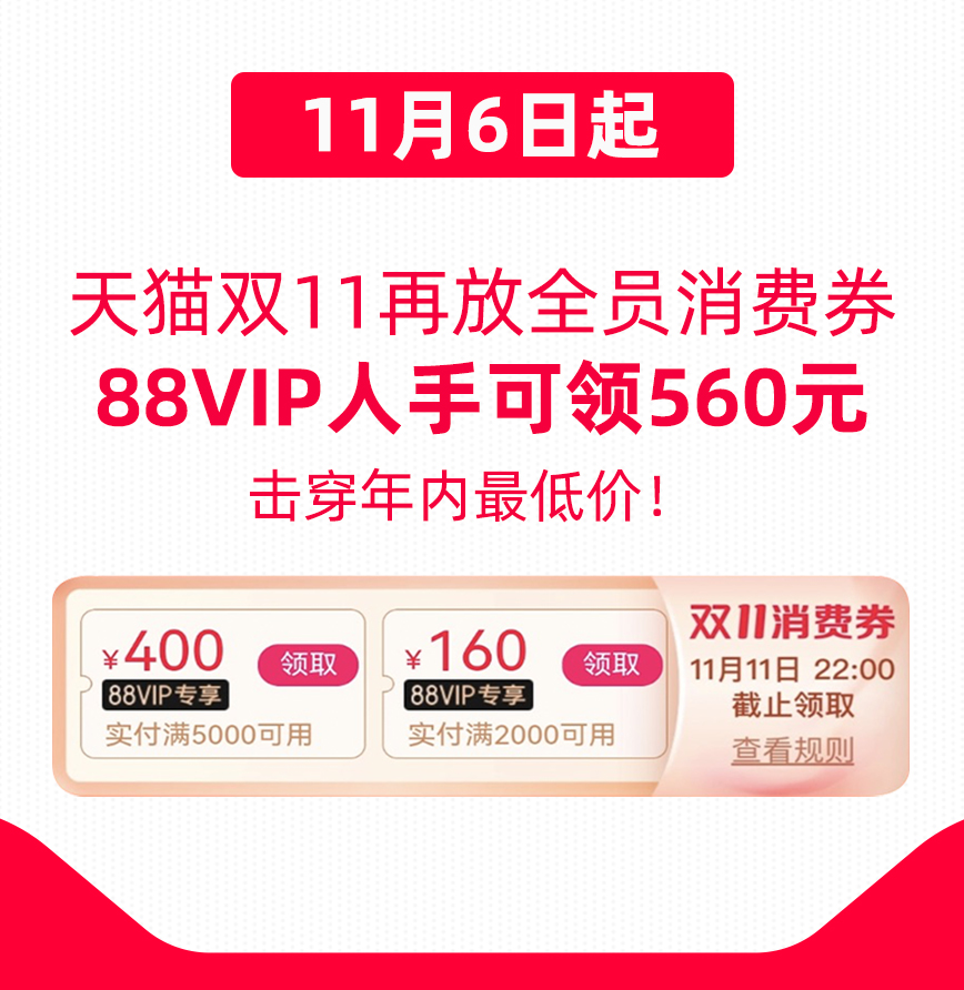 消費者只需登陸淘寶APP,進入雙11主會場后即可領取,金額為10元到60元不等,可疊加“滿200元-30元”滿減折扣使用。88VIP用戶還可以額外領到“滿5000元-400元”和“滿2000元-160元”兩張大額消費券。