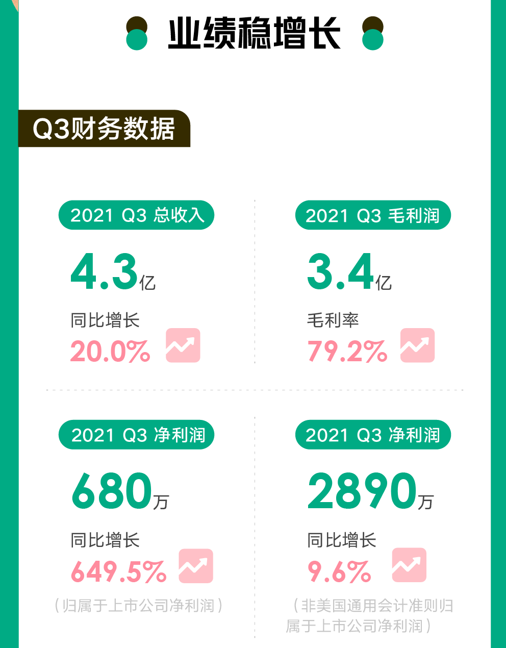 在收入持續(xù)增長(zhǎng)的同時(shí),新氧盈利能力也不斷提升。第三季度,新氧實(shí)現(xiàn)毛利潤(rùn)3.418億元,保持毛利率在79.2%的高位。本季度,歸屬于上市公司凈利潤(rùn)680萬(wàn)元,同比增長(zhǎng)649.5%,非美國(guó)通用會(huì)計(jì)準(zhǔn)則歸屬于上市公司凈利潤(rùn)2890萬(wàn)元,同比增長(zhǎng)9.6%。