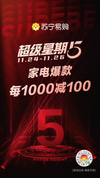 本次超級星期五分為20日至23日的預購期,和24日至26日的全面爆發期。大促期間蘇寧易購攜手超級品牌,以超級力度開展多種滿減、免息、折扣活動。家電產品每1000減100,非家電產品每200減30,此外還有蘇寧易購品牌回饋直播,SUPER會員專享優惠,云鉆抵現金等活動,年度感恩回饋消費者。