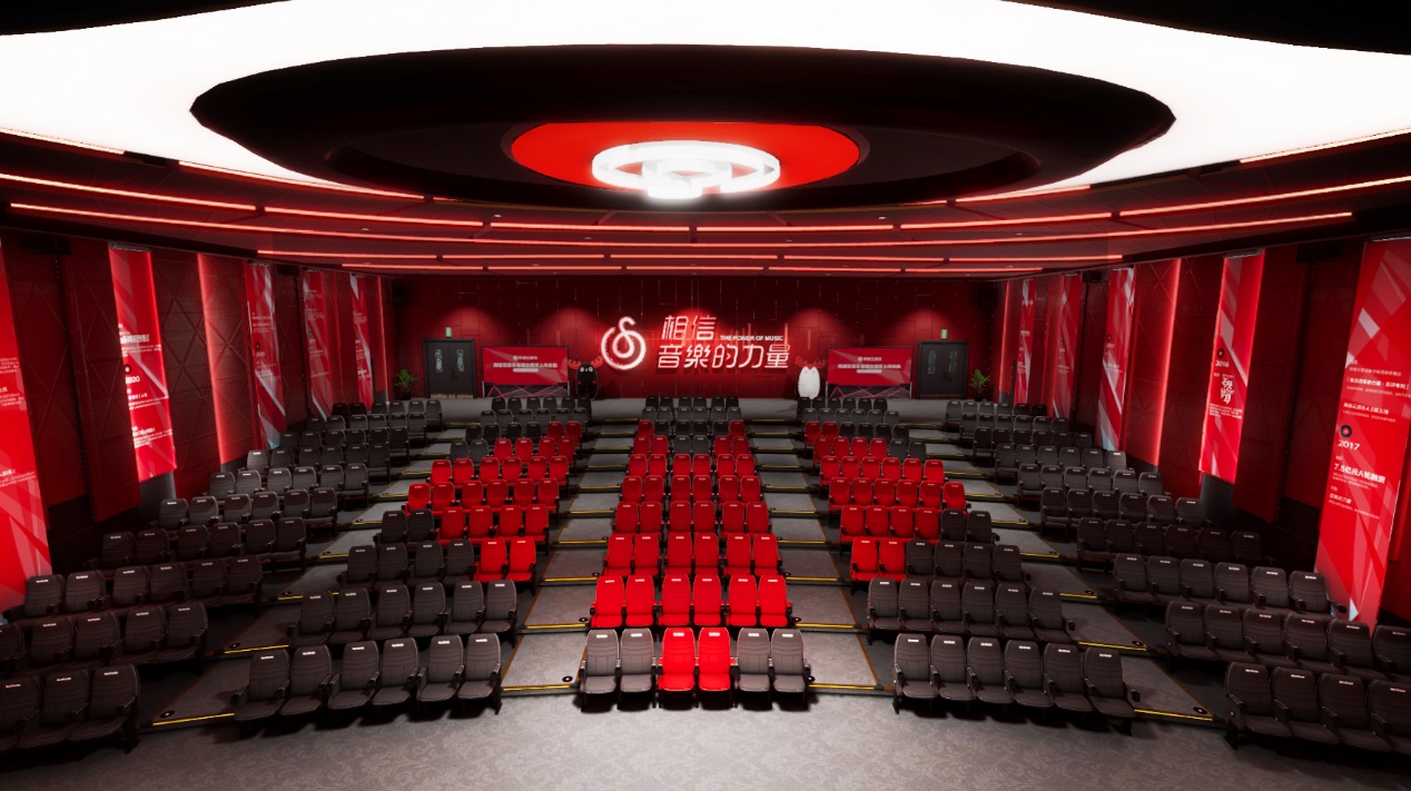 除了三個“丁磊”同時敲鑼外,整個會場的布置也隨處體現音樂熱愛者的元素,不僅座位是愛心的形狀,還有后排是“相信音樂的力量”的閃爍燈牌,舞臺上是轉動的黑膠唱片。更有意思的是,參與觀禮的嘉賓可以操控自己的“數字分身”,與AI虛擬人“丁磊”一起完成交流、合影、跳舞等等互動。