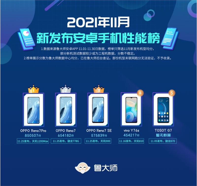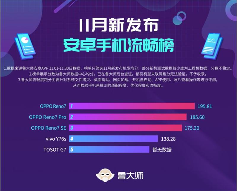 魯大師近日發布11月新發布安卓手機性能排行榜以及11月新發布安卓手機流暢榜,其中在性能榜中,OPPO Reno7 Pro、OPPO Reno7、OPPO Reno7 SE分別占據前三;在流暢榜中,OPPO Reno7、OPPO Reno7 Pro、OPPO Reno7 SE分別占據前三。OPPO Reno7系列搭載最新ColorOS 12系統,其在性能和流暢層面的深度優化,是OPPO Reno7系列稱霸魯大師雙榜的關鍵。
