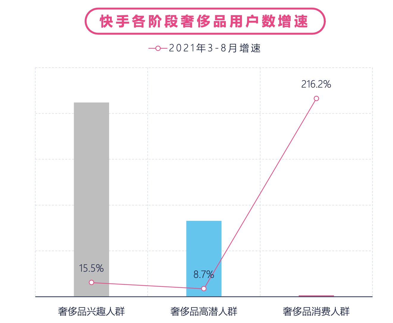 在快手?jǐn)?shù)億用戶中,奢侈品用戶的占比較高,且奢侈品消費(fèi)用戶增速強(qiáng)勁。報(bào)告指出,2021年8月,快手上對(duì)奢侈品有興趣的用戶已破億,超八千萬用戶具備消費(fèi)潛力,曾在平臺(tái)上購買過奢侈品的用戶近百萬,對(duì)比3月,消費(fèi)奢侈品的用戶數(shù)量增漲超過兩倍。