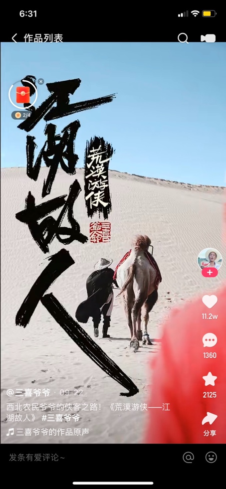 大漠孤煙,赤日炎炎,一位俠客仗劍而來,臉龐冷峻,著一襲戰袍,牽一匹駱駝,背影蒼涼。而在視頻的上一秒,這位俠客還是在玉米地里侍弄莊稼的尋常老人,白色汗衫配西瓜紅背心,戴頂草帽,佝僂著身軀,一回頭,沖兒子的鏡頭憨厚地笑。