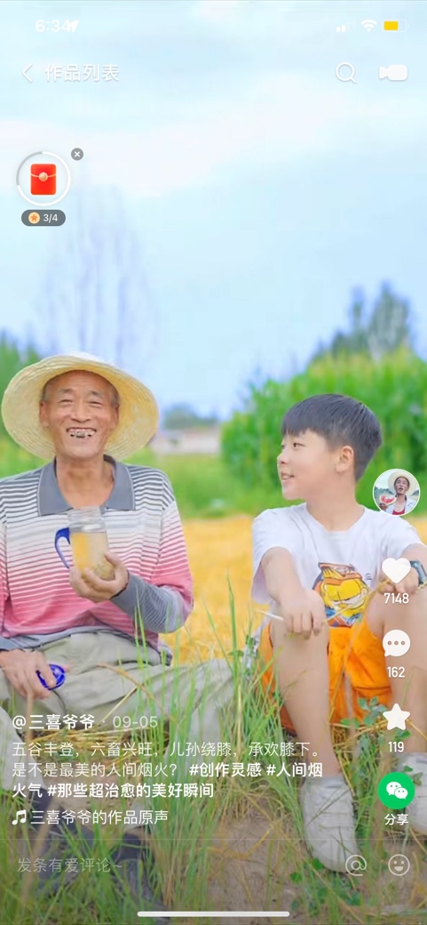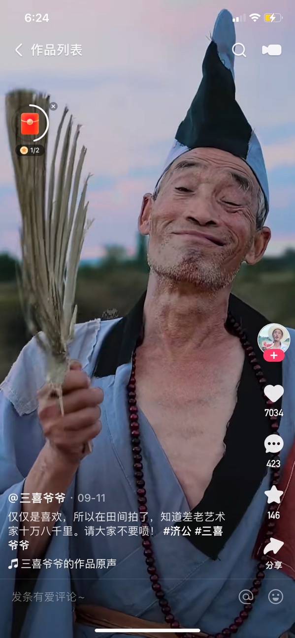 讓三喜爺爺開心的還不止這些。他發現,自從拍短視頻以來,他和兒子之間的話也變多了,從前的孤單也消解了不少。之前兒子回家后大多時間都是躺在床上玩手機,和他聊天也就是說說工作上的事兒,他不太懂也說不上幾句。但現在,他可以和兒子聊下次拍什么造型、扮演什么形象、背景地點選在哪里。三喜爺爺還經常讓兒子推薦自己可以演繹的某類角色的相關電影,“我看了就知道咋演了”。他在視頻中表達自己非常享受現在的美好生活,同時爺爺也在思考,可以為自己的村子、為鄉親們做些什么。