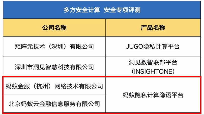 本次安全測評共有9款隱私計算產品通過,螞蟻集團是唯二兩項測評都通過的企業。