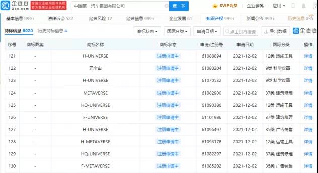 近日,中國第一汽車集團有限公司申請注冊多個“元宇宙”、“METAVERSE”、“HQ METAVERSE”、“F METAVERSE”商標,國際分類涉及運輸工具、廣告銷售等,當前商標狀態均為“注冊申請中”。(速途網)