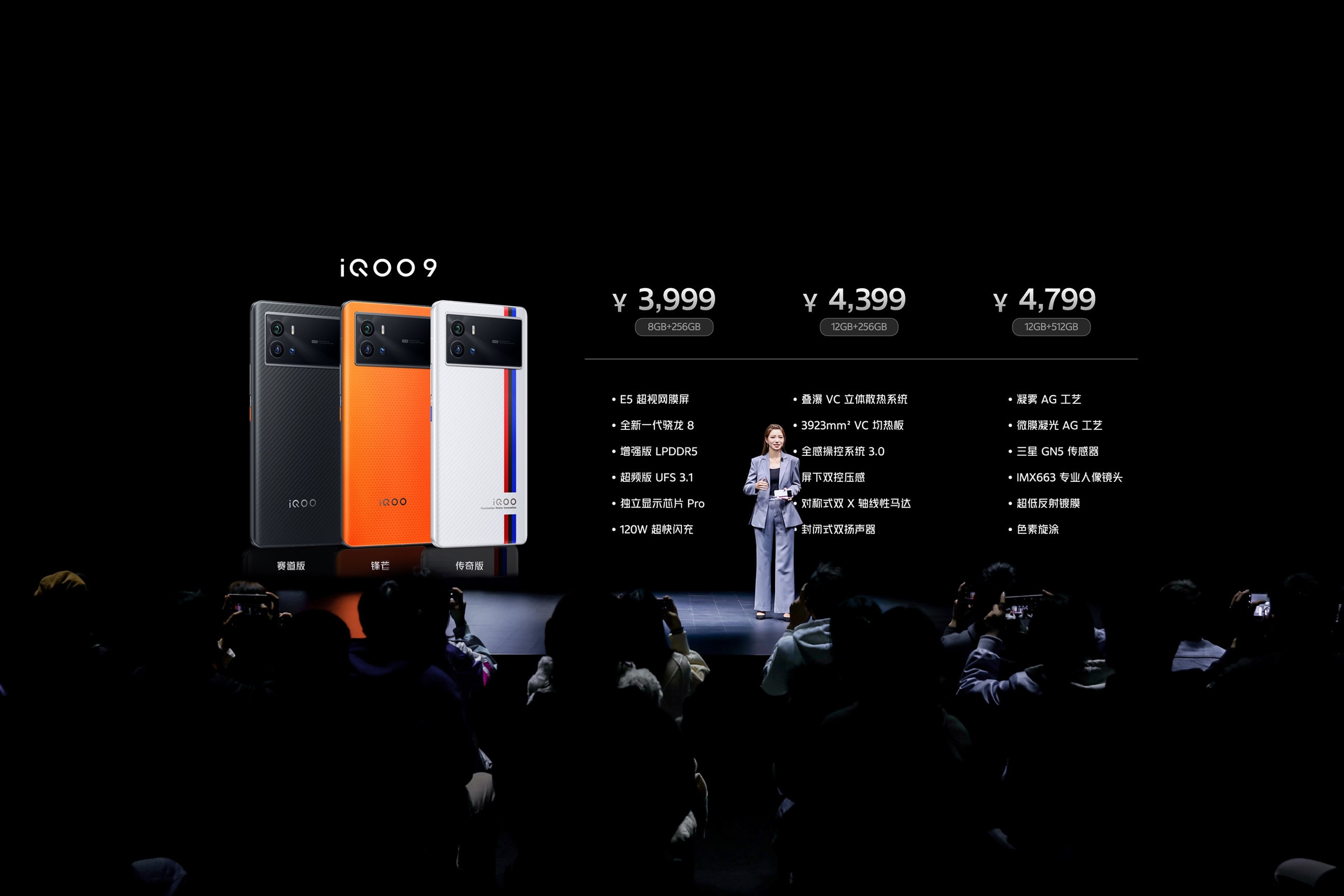 iQOO 9 Pro提供傳奇版、燃擎兩種配色:傳奇版續寫iQOO經典設計,借助光啞AG拼接工藝實現了三色紋與白色玻璃的虛實流動,帶來精致觀感與奪目光效;燃擎再現了源于賽車的經典橙色,用“素皮”材質還原了賽車內飾上的碳纖觸感。iQOO 9提供傳奇版、賽道版、鋒芒三種配色,背蓋玻璃采用最新微膜凝光AG工藝,帶來幾乎不沾染指紋、獨特且舒適的阻尼觸感。