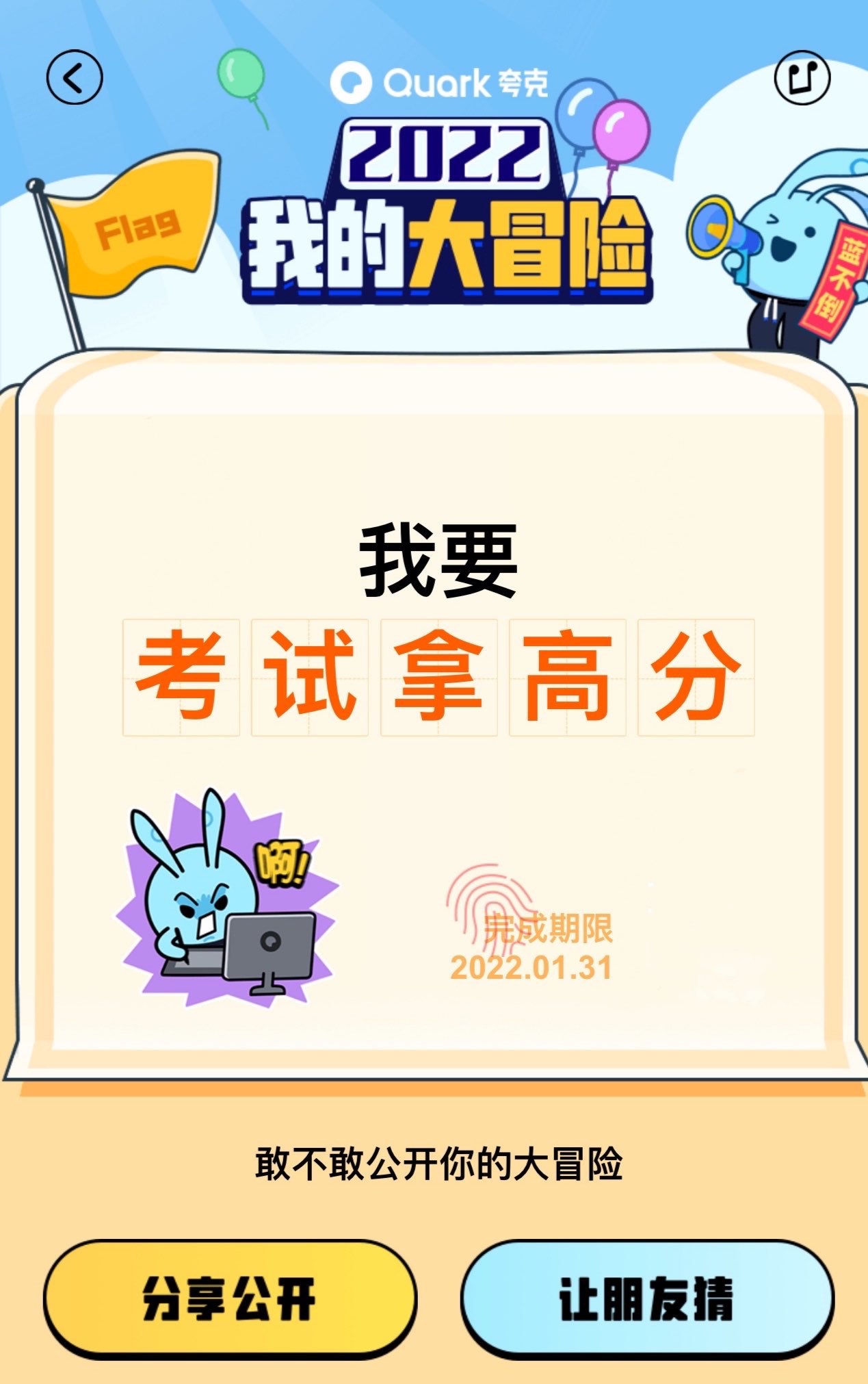 95后的新年flag都是啥?夸克App線上跨年活動“2022我的大冒險”中,眾多年輕人許下了新年愿望。其中,考試拿高分、堅持背單詞、面試必過、每天早睡等出現(xiàn)頻率最高。可以看出,95后的新年flag中,學習、工作、生活一個也不能少,每個flag都承載了這屆年輕人對新一年的美好展望。
