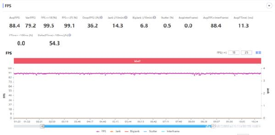 @手機中國的測試中,在《和平精英》各種復雜的場景中,包括野外、室內、跑圖開車等,長期幀率穩定,不會出現斷崖式下降。流暢度非常好,平均幀率88.4幀。