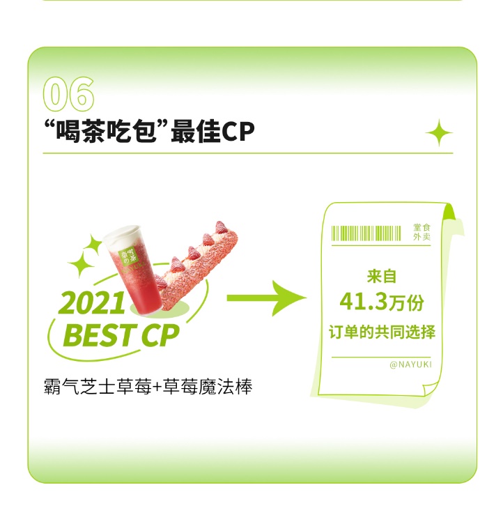 “一杯好茶,一口軟歐包”,茶飲配烘焙,也從奈雪開始,成為新式茶飲行業的潮流。過去一年中,奈雪最受歡迎的飲茶吃包組合是什么?報告顯示,霸氣芝士草莓和草莓魔法棒是41.3萬份訂單的共同選擇,成為消費者最喜歡的搭配。據了解,這一王牌搭配已連續6年成為銷冠CP。