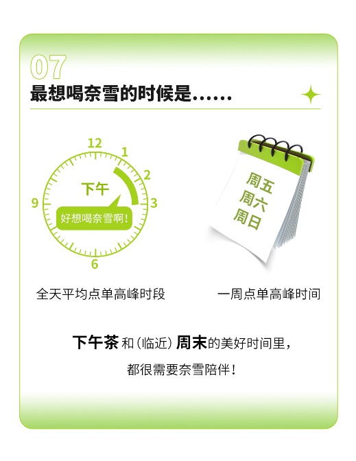 報告顯示,奈雪全天平均點單高峰時段為下午13到15點。在下午茶時間喝上一杯茶飲,或再配上一個軟歐包,正在成為一種潮流。以一周的時間來看,周五、六、日是人們最愛喝奈雪的時候,點單量最高。