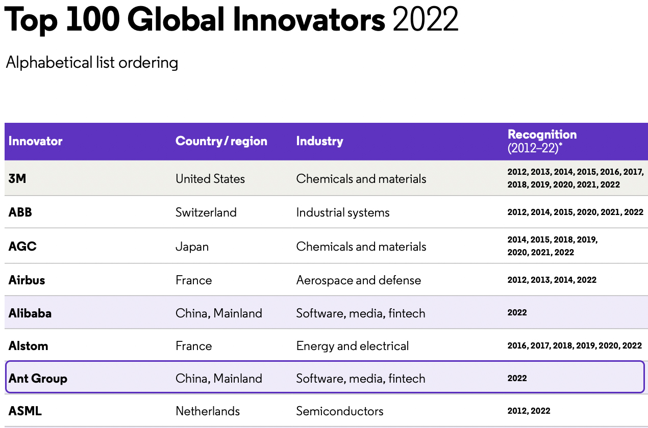 2月23日,全球領(lǐng)先的信息服務(wù)提供商科睿唯安(原湯森路透知識產(chǎn)權(quán)與科技事業(yè)部)發(fā)布《2022年度全球百強創(chuàng)新機構(gòu)》報告,螞蟻集團(tuán)、阿里巴巴、華為等五家來自中國大陸的企業(yè)入選,一同入選的還包括英特爾、HP等科技公司。
