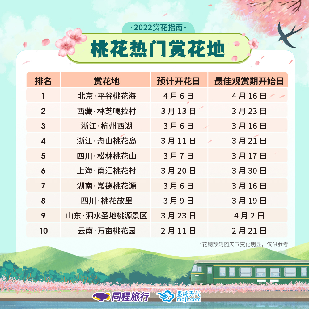 北京平谷桃花海毗鄰北京,吸引了京津冀周邊居民,成為國內(nèi)熱度最高的桃花景區(qū)。西藏林芝藏在雪山草原懷抱里的桃花海,被同程旅行用戶稱贊為“人間驚喜”,關(guān)注度位居全國第二。今年全國大部分地區(qū)桃花的花期與往年持平,華南地區(qū)由于降水較多,氣溫較低,花期比去年晚4-6天。
